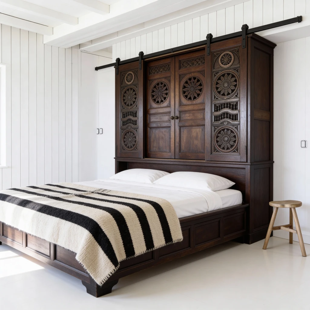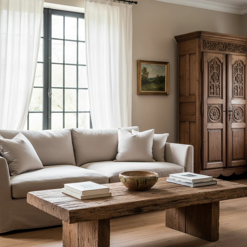 Bois flotté, chêne blond et meubles bretons. La beauté brute du granit et du bois patiné.